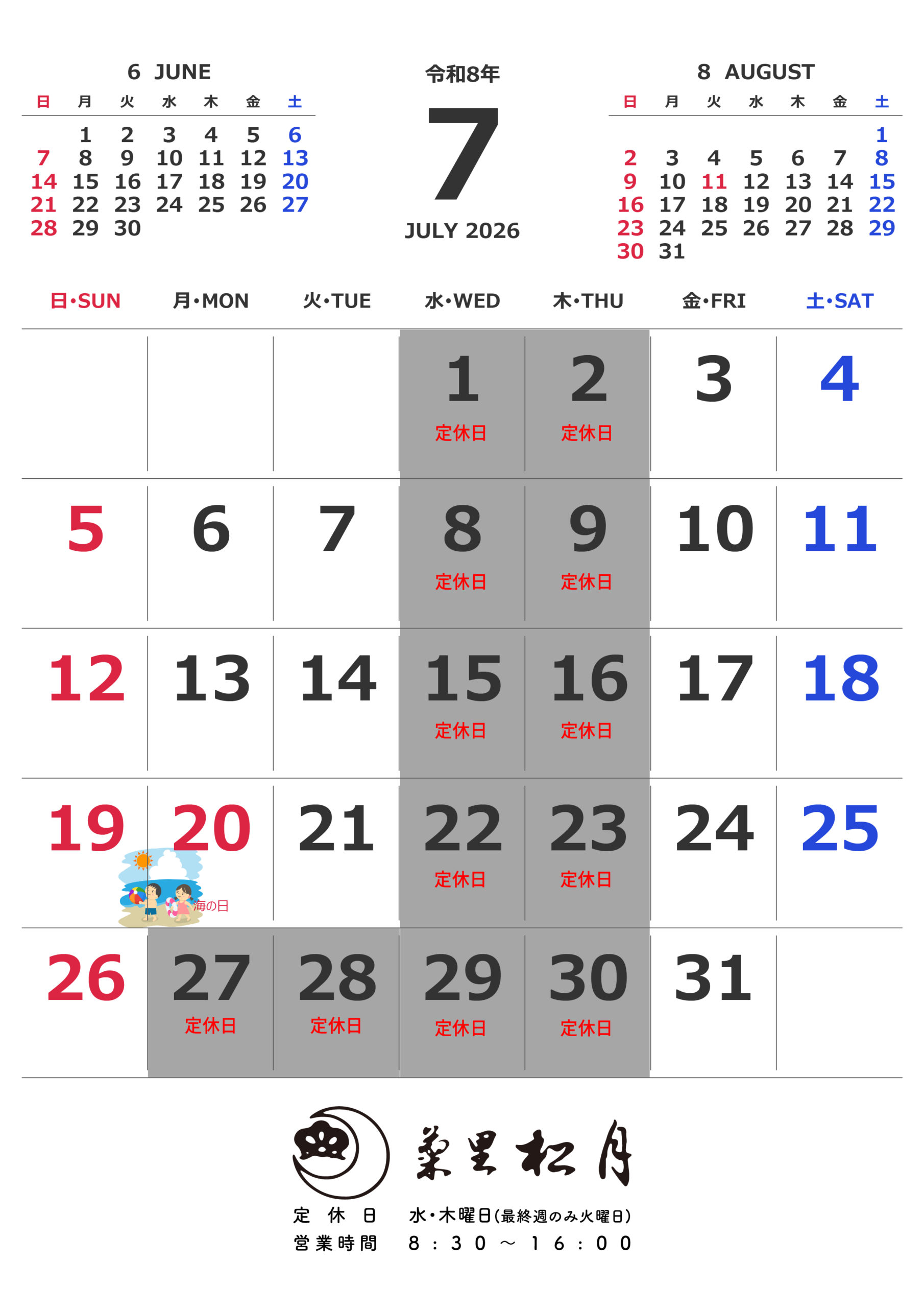 2024年6月より、毎週水・木曜日、最終週は火・水・木曜日を定休日(お休み)とさせて頂きます。